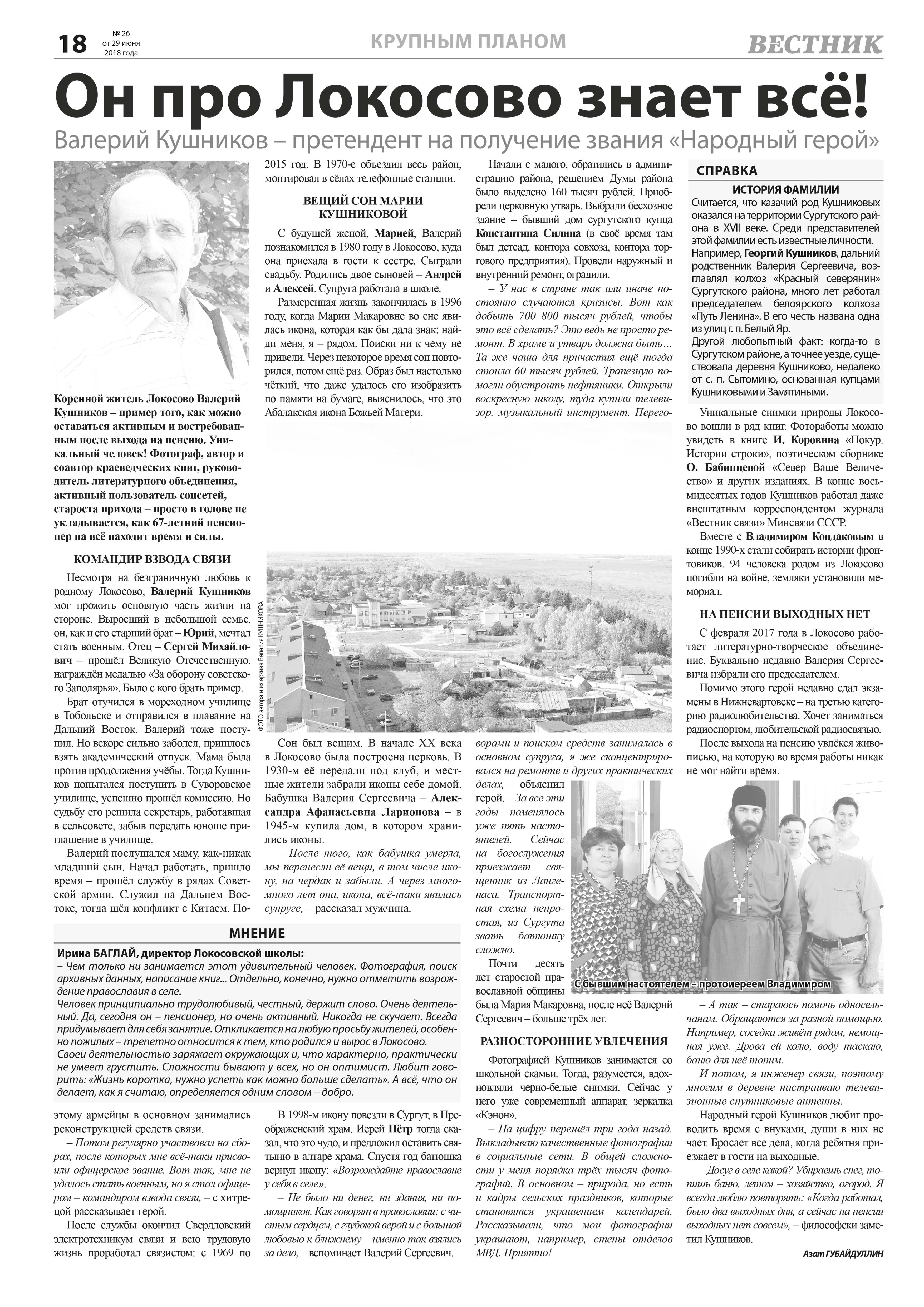«Он про Локосово знает всё! Валерий Кушников – претендент на получение звания «Народный герой» – фотограф, автор и соавтор краеведческих книг, руководитель литературного объединения «Локосовское», староста прихода. Подробнее о земляке читайте в газете «Вестник».