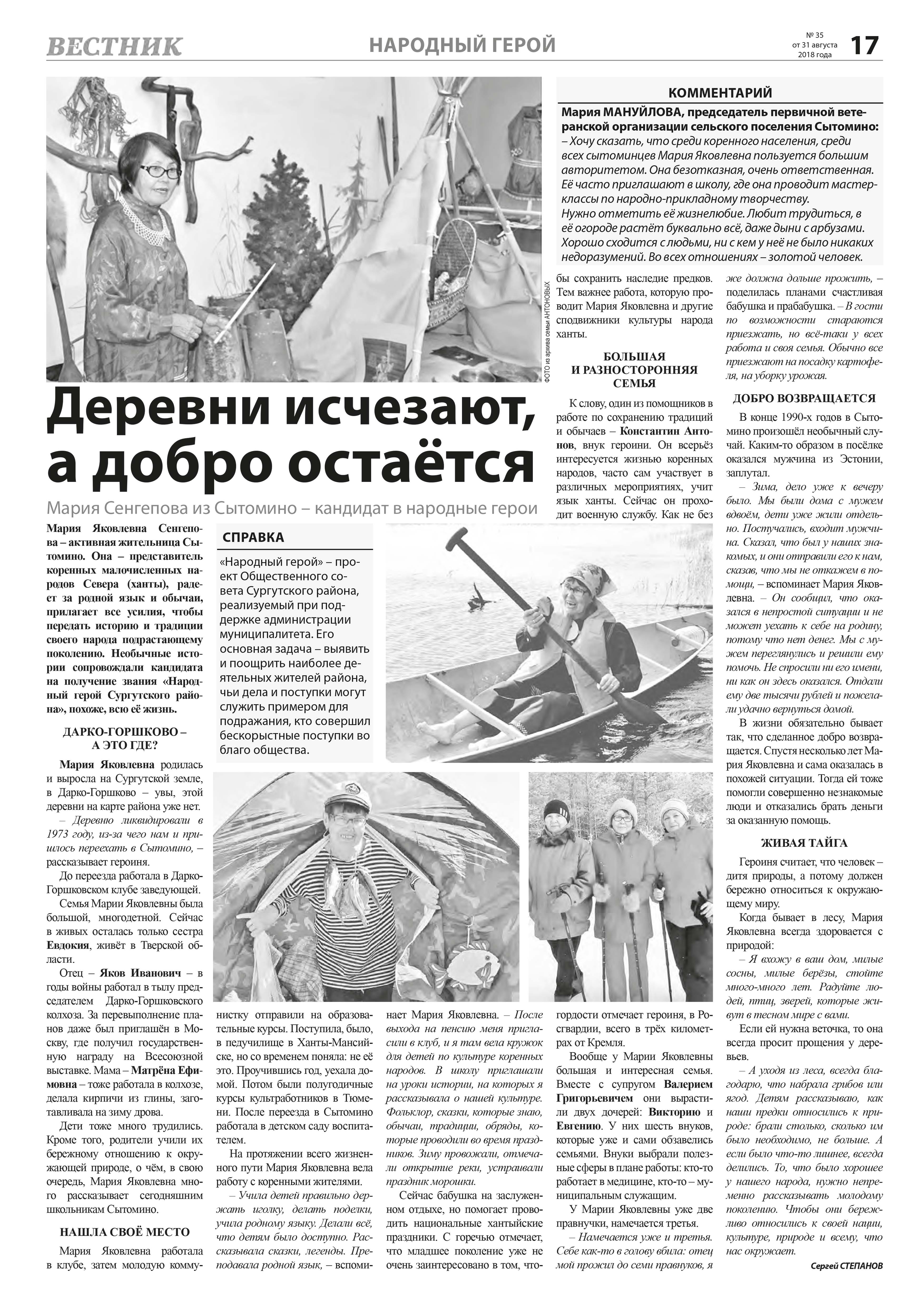 «Деревни исчезают, а добро остаётся». Статья в газете «Вестник» рассказывает о Марии Сенгеповой из с. Сытомино – кандидате в народные герои.