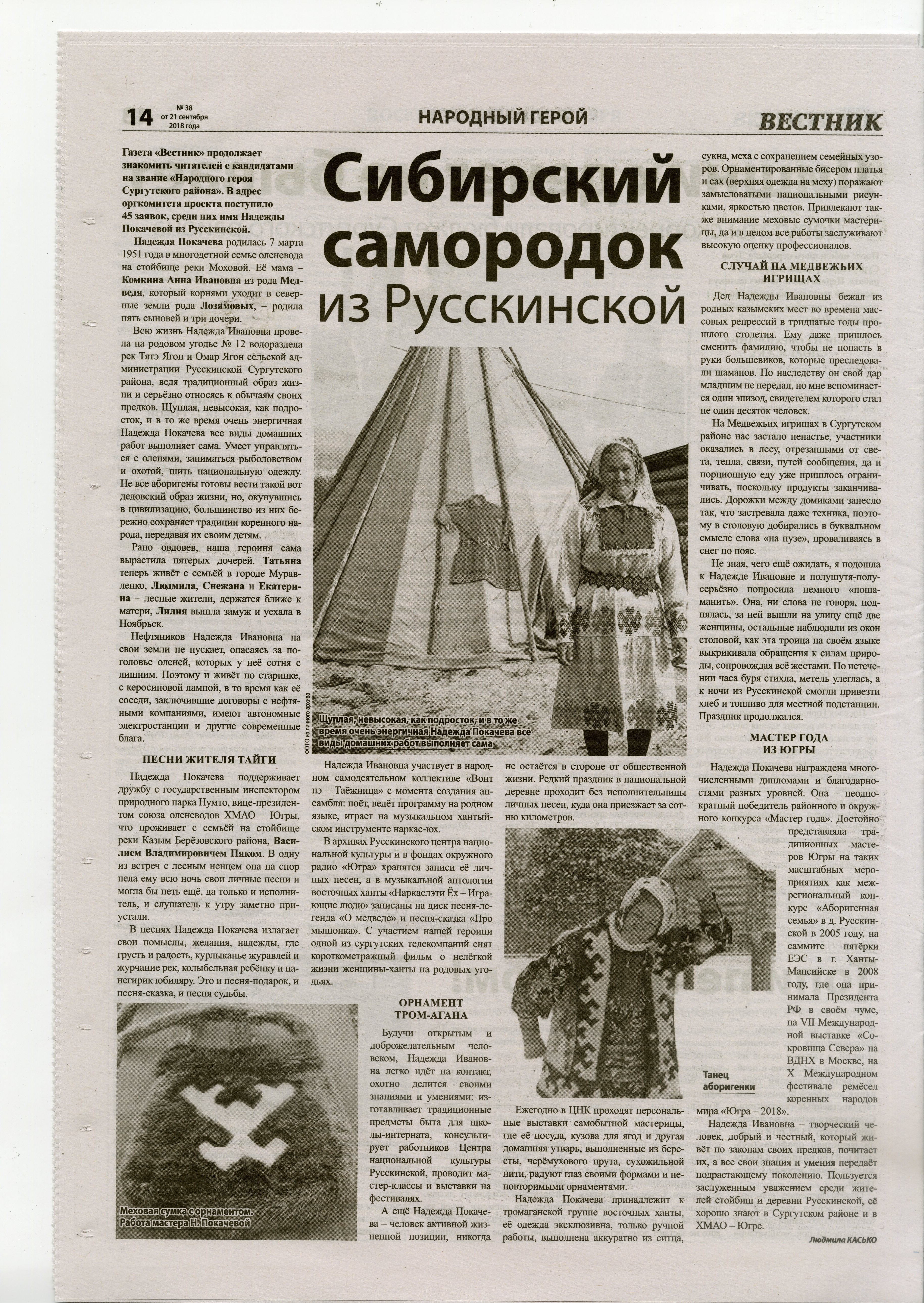 «Сибирский самородок из Русскинской». Рассказ о Надежде Сопочиной из д. Русскинской – кандидате на звание «Народный Герой» – на страницах газеты «Вестник».