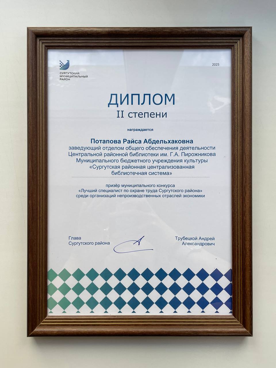 В Сургутском районе завершился серьёзный профессиональный конкурс среди специалистов по охране труда. Потапова Райса Абдельхаковна, заведующая отделом общего обеспечения деятельности Центральной районной библиотеки им. Г. А. Пирожникова, с честью выдержала все испытания и завоевала диплом II степени в муниципальном конкурсе «Лучший специалист по охране труда Сургутского района» среди организаций непроизводственных отраслей экономики!