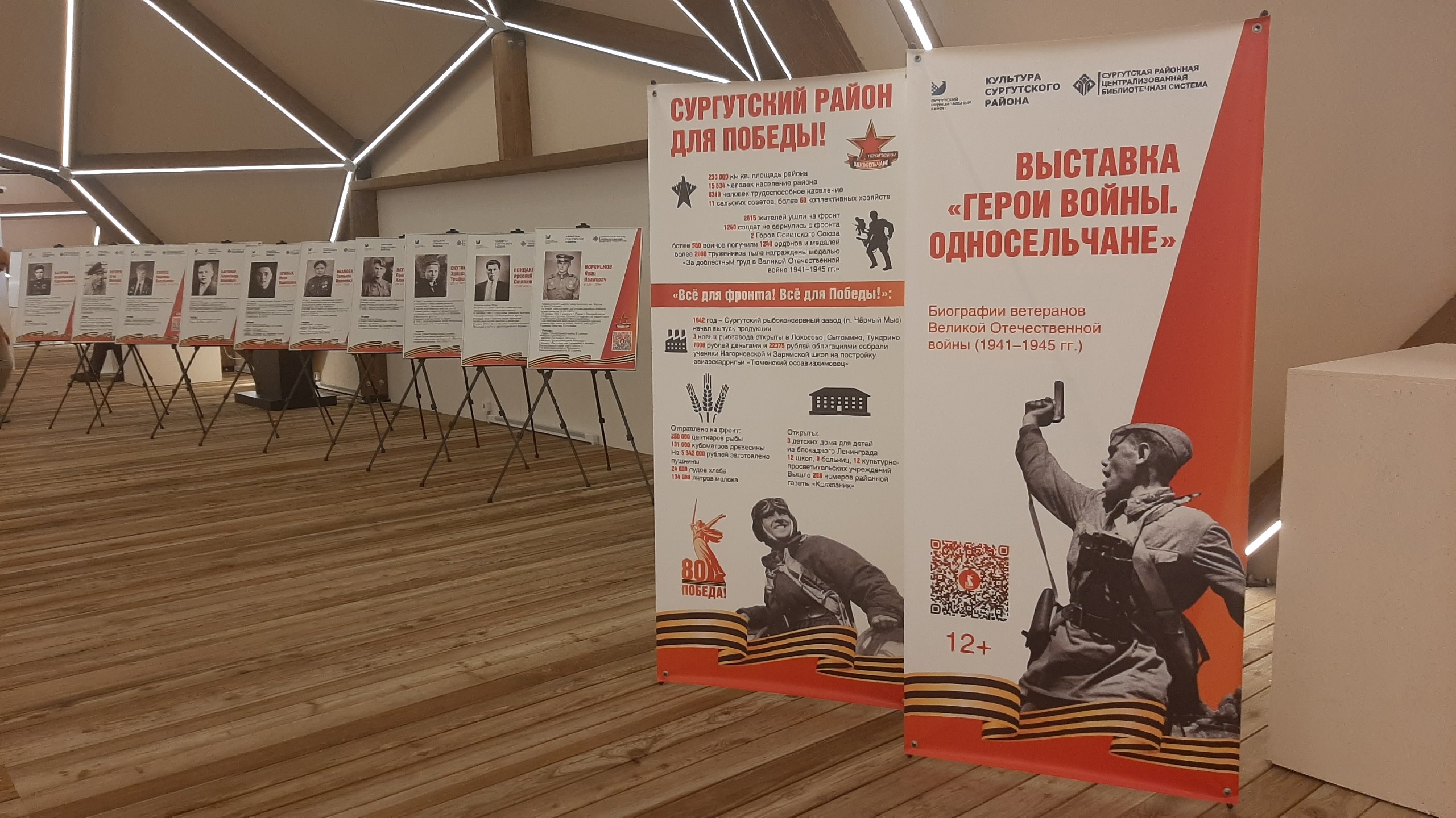 На выставке представлено 20 биографий ветеранов Великой Отечественной войны с фотографиями, их наградами и подвигами со всех поселений Сургутского района. Особое место на выставке отведено самоотверженному труду земляков в тылу.