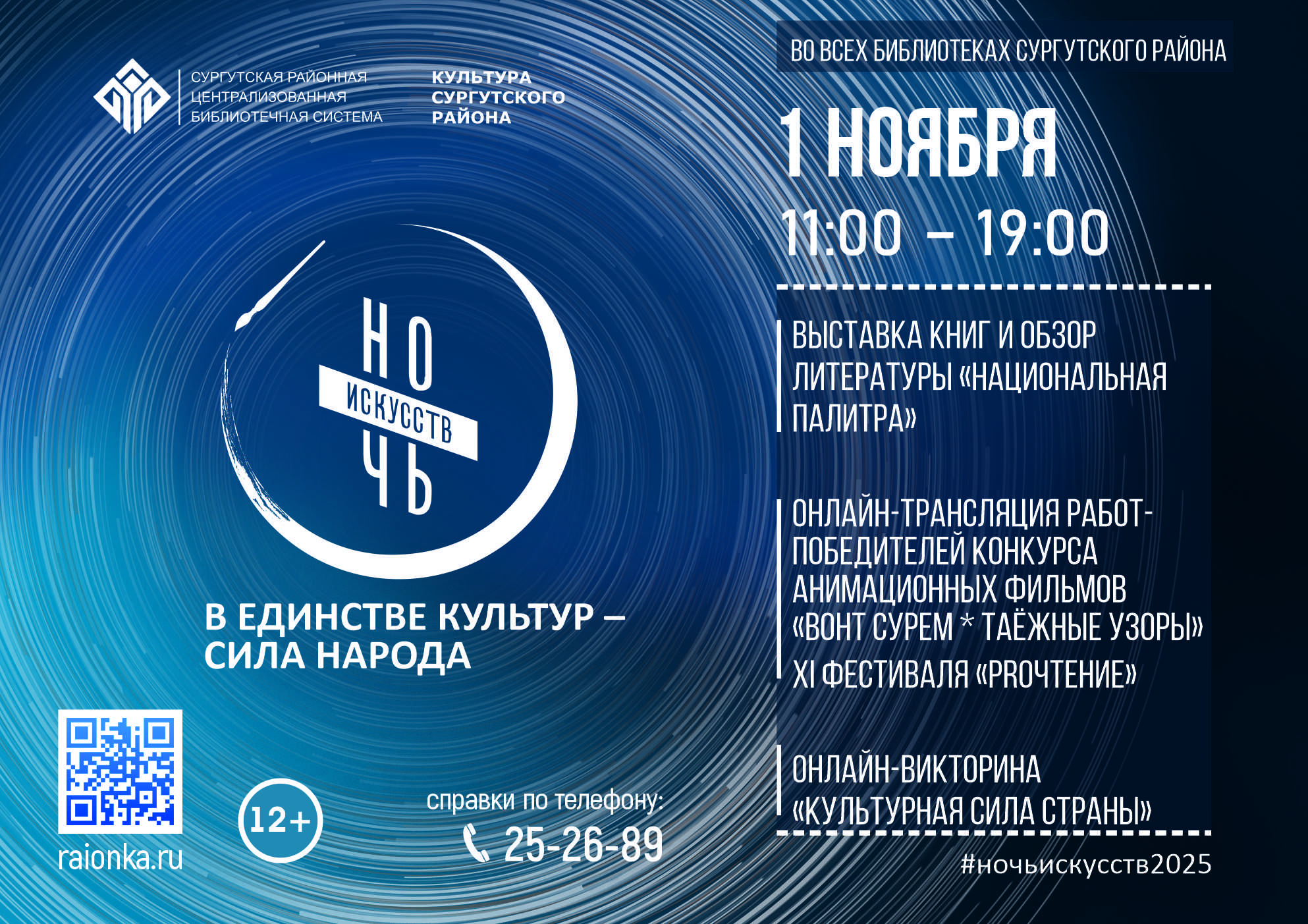Читателям библиотек Сургутского района предоставляется уникальная возможность окунуться в атмосферу ярких культурных традиций народов Ханты-Мансийского автономного округа – Югры на ежегодной акции «Ночь искусств», объединённой вдохновляющим лозунгом «В единстве культур – сила народа!».