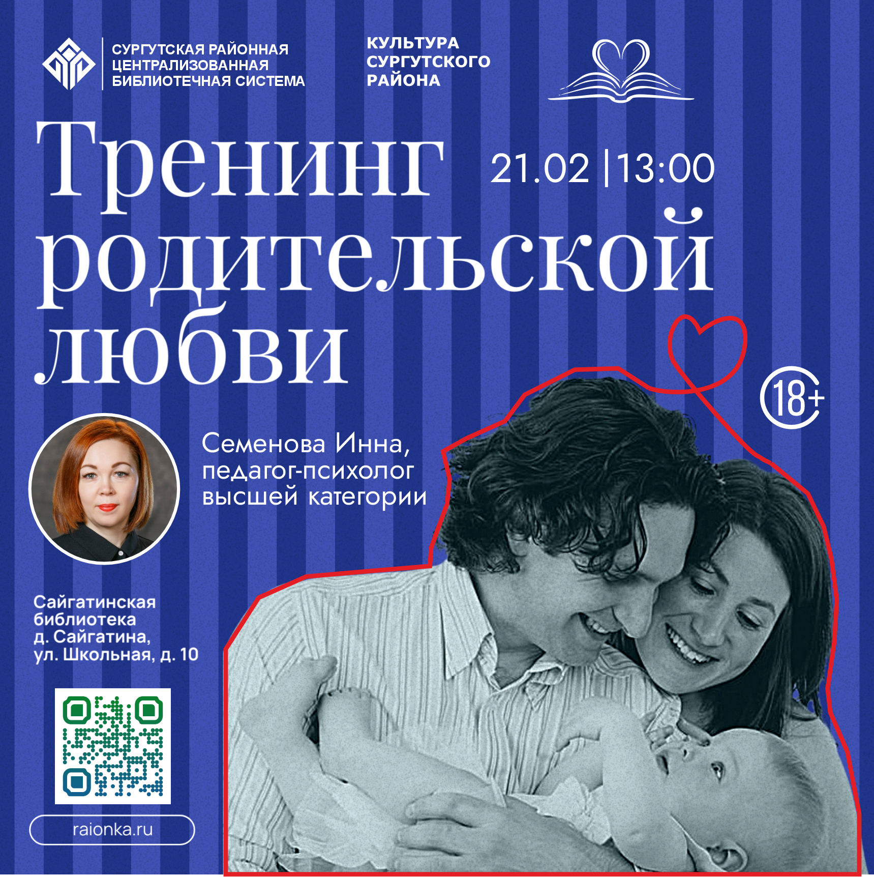 21 февраля в 13:00 в Сайгатинской библиотеке пройдёт тренинг для родителей от педагога-психолога Инны Семёновой. На тренинге участники познакомятся с практическими техниками взаимодействия с ребёнком, а также с простыми и эффективными способами снижения эмоционального напряжения – как у детей, так и у взрослых. Через упражнения и обсуждения родители смогут по-новому взглянуть на привычные ситуации воспитания и лучше понять себя в роли мамы и папы.