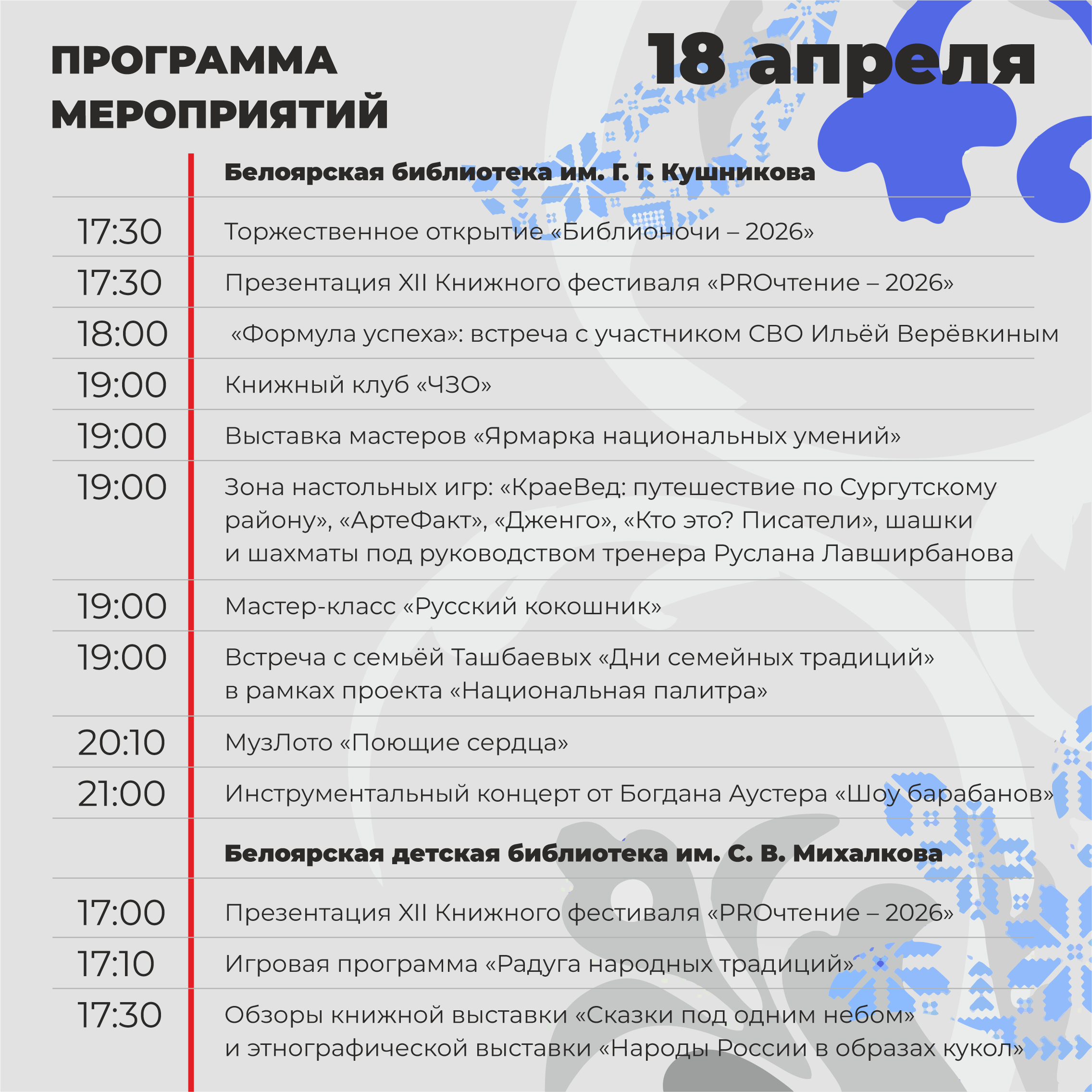 18 апреля пройдёт ежегодная Всероссийская акция «Библионочь – 2026». К масштабному культурному событию присоединятся все библиотеки Сургутского района, они подготовили для гостей 67 мероприятий.