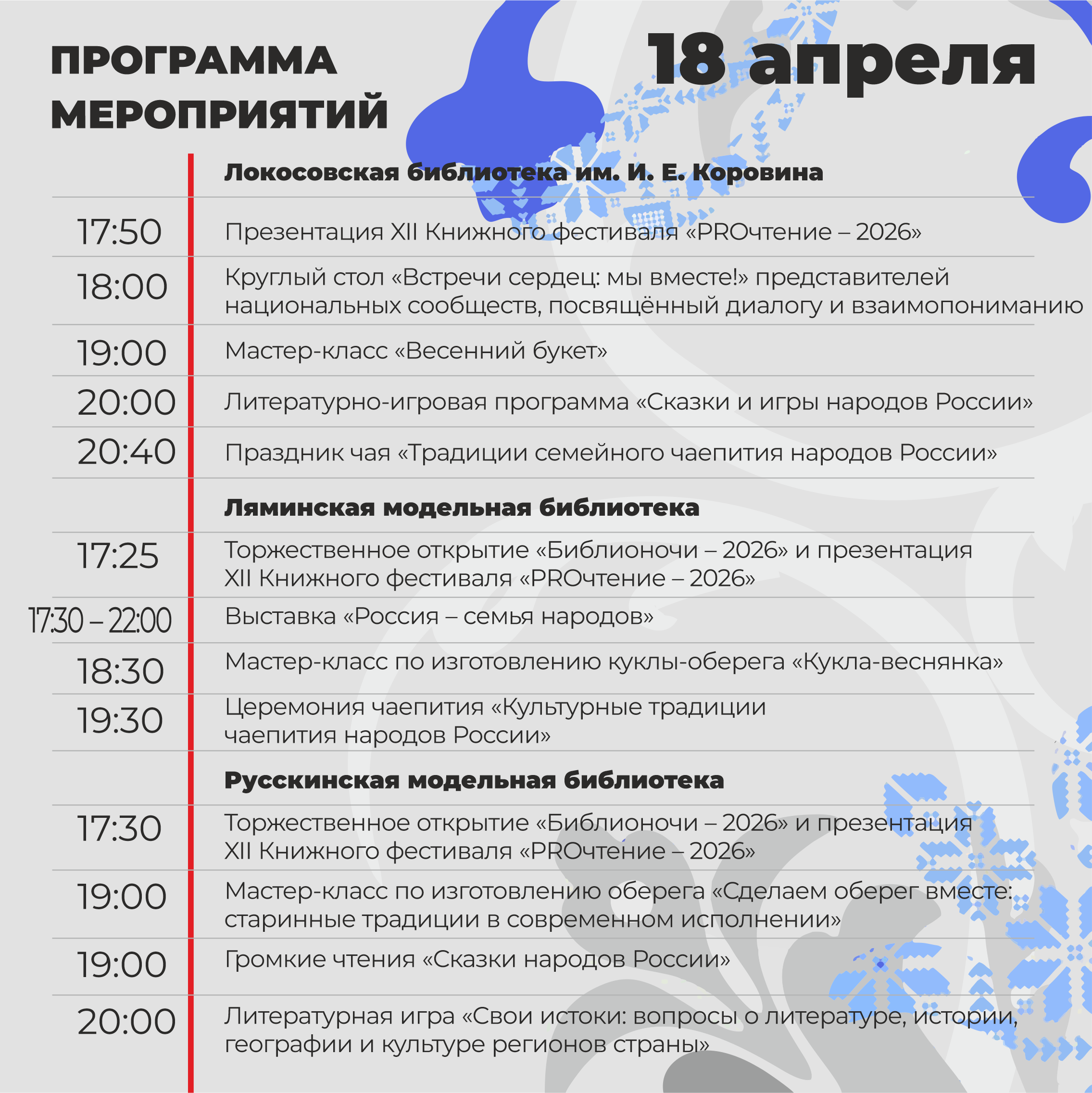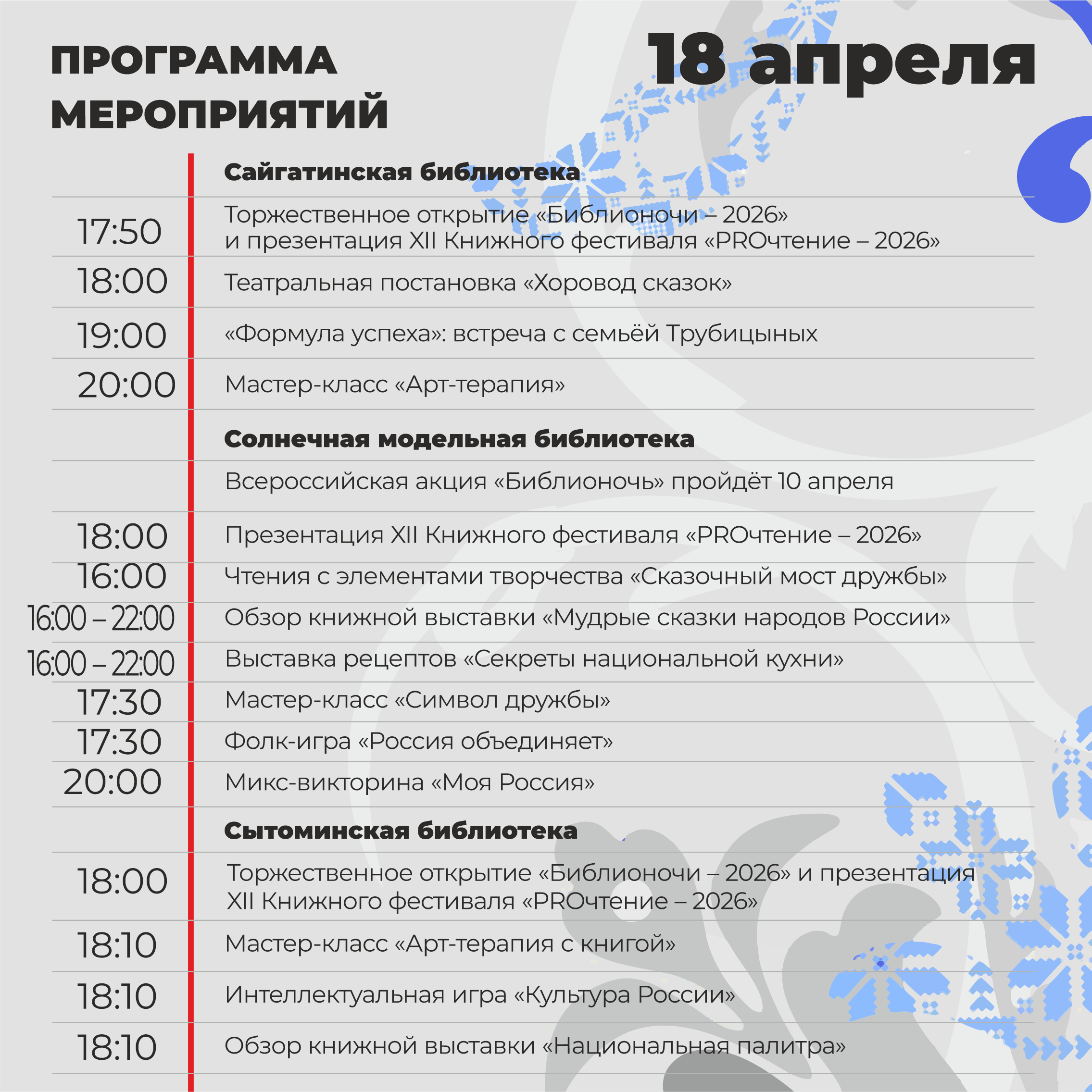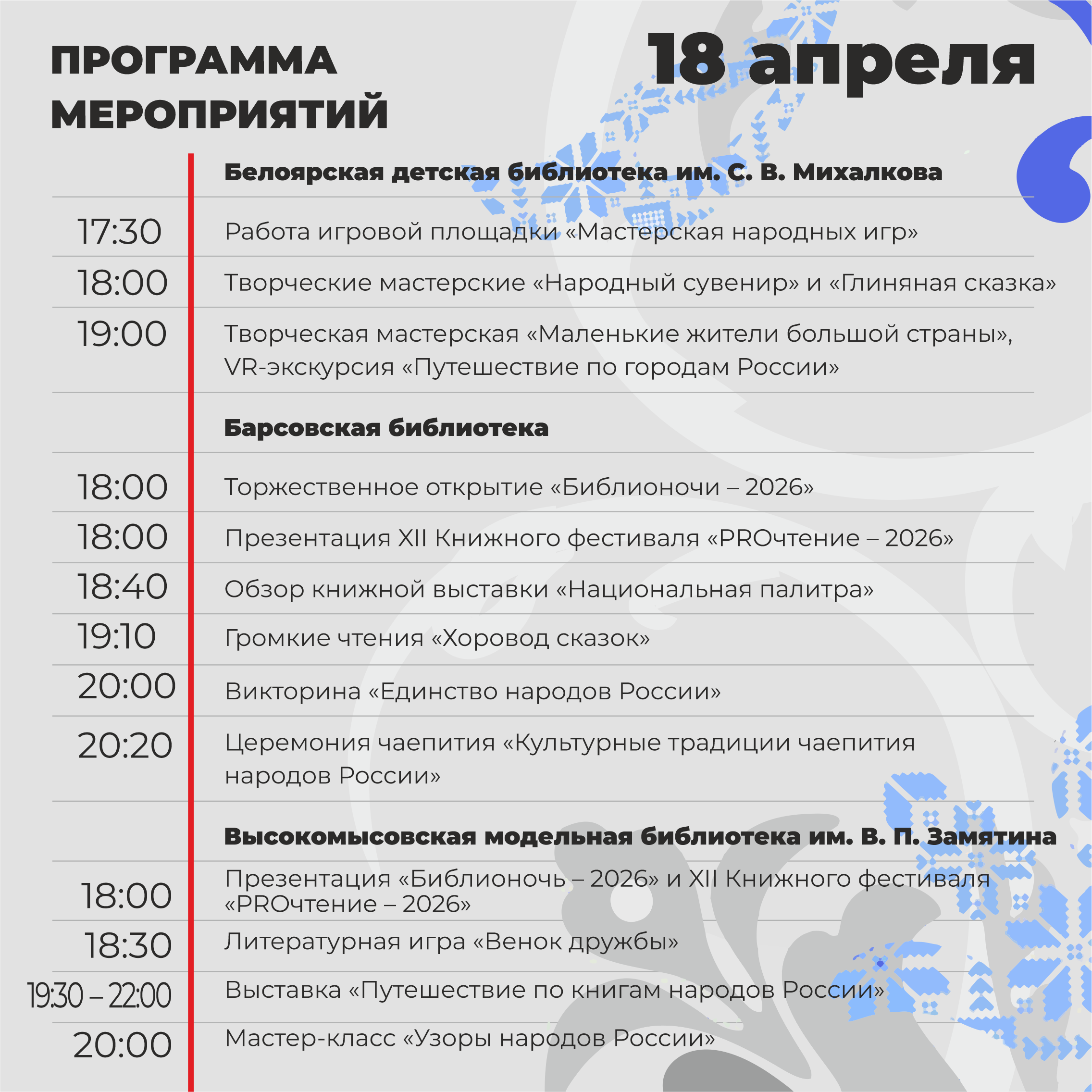 «Библионочь» – это крупный всероссийский проект, который уже в 15-й раз объединяет любителей книги, искусства и интеллектуального досуга по всей стране. В 2026 году акция приурочена к Году единства народов Российской Федерации и посвящена идеям дружбы, взаимопонимания и уважения к культурному многообразию народов нашей страны. Девиз этого года – «Единство народов – сила России!». Участие в акции – отличная возможность провести вечер в кругу семьи и друзей, открыть для себя новые книги и форматы, познакомиться с богатыми культурными традициями народов России и почувствовать атмосферу единства и творчества.