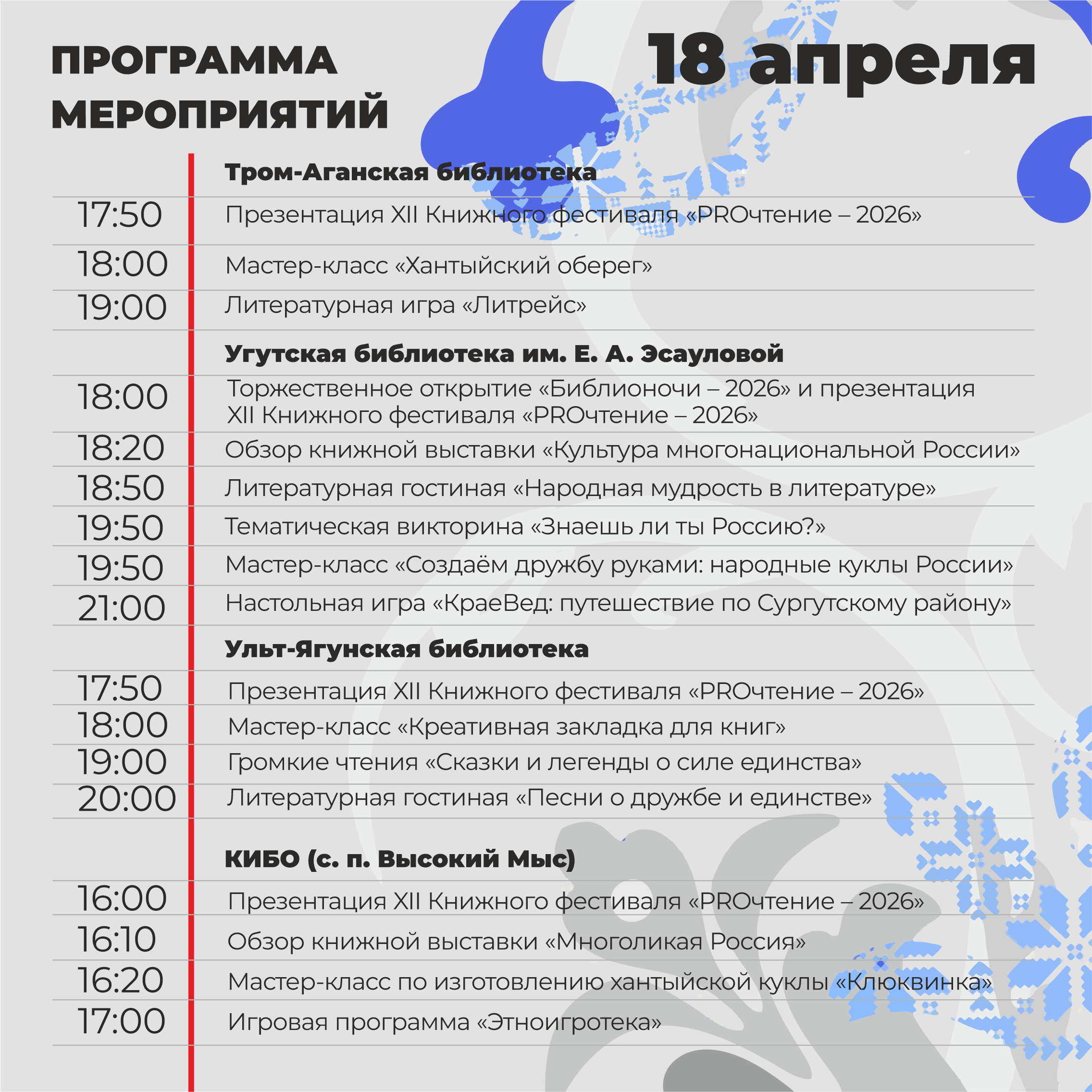 Посетителям презентуют самое яркое книжное событие Сургутского района – Фестиваль «PROчтение», проведут обзоры книжных выставок о народах России, их культуре, «громко» прочитают народные сказки. В каждой библиотеке проведут мастер-классы, на них будут мастерить и куклу-оберег, и кокошник, и брошь по канонам русских традиций, научат расписывать народные сувениры, изготовят хантыйские обереги, покажут, как делать книжные иллюстрации и создавать необычные закладки. От театральной постановки, чтения любимых книг, общения с яркими людьми, до церемонии чаепития, конкурсов, викторин и игр – всё это и не только – в библиотеках поселений.