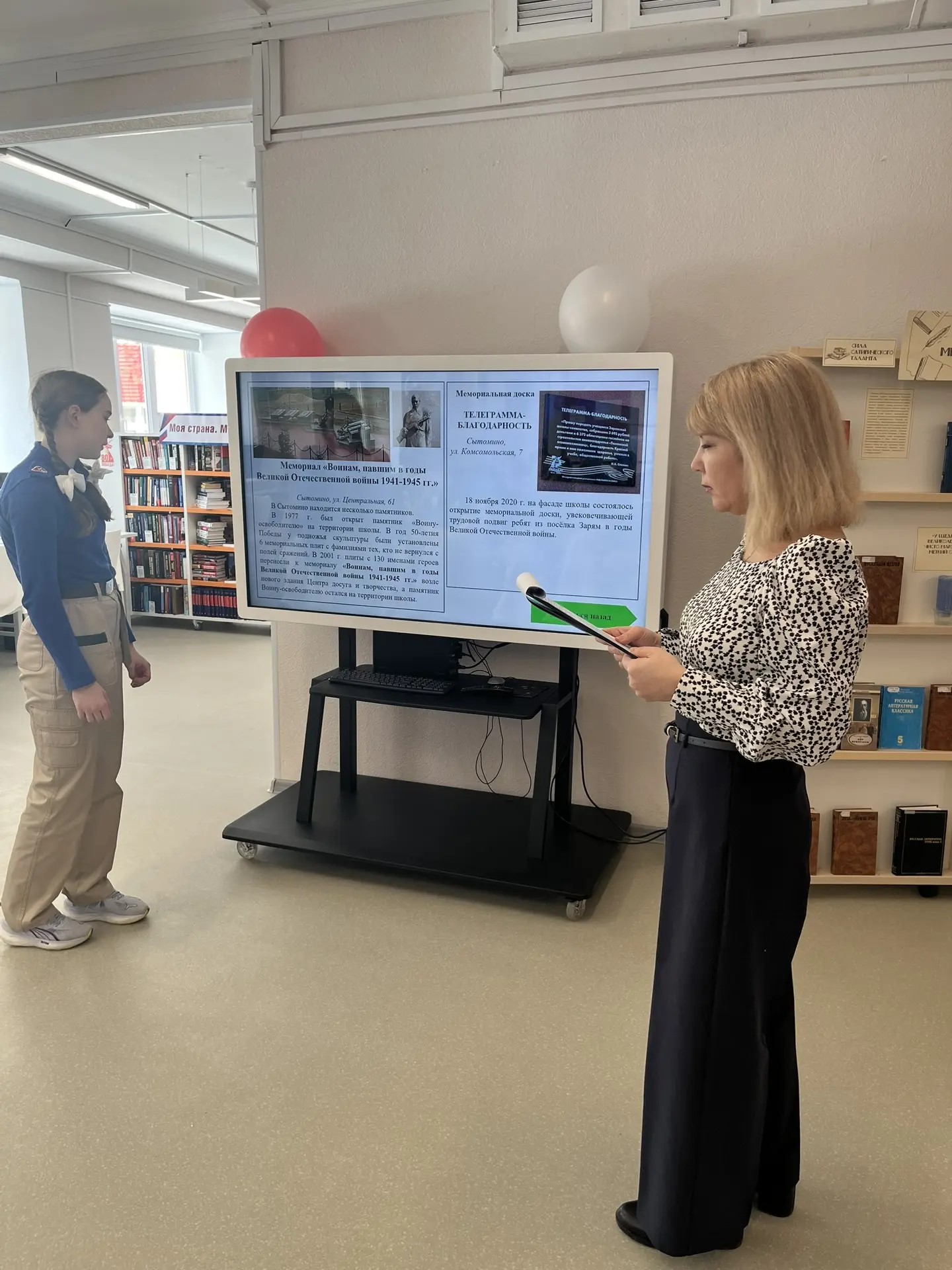 На интерактивном экране звёздами были отмечены поселения, где на карте муниципалитета находятся мемориалы и обелиски, посвящённые Великой Отечественной войне 1941-1945 гг. Кликнув на звезду, ребята попадали в одно из 13 поселений и рассматривали памятник, который там установлен, знакомились с информацией о земляках, чьи имена увековечены на мемориальных досках.