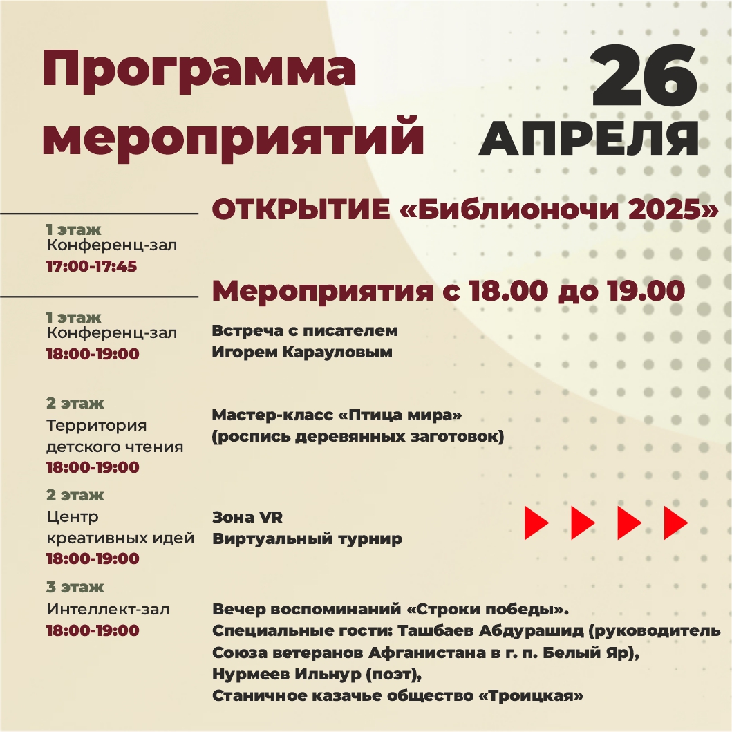 Библионочь – это масштабный культурный проект, который объединяет любителей книг, искусства и интеллектуального досуга. В этом году акция пройдёт в России в 14-й раз и будет приурочена к Году защитника Отечества и 80-летию Великой Победы. Тема этого года – «Свои герои», девиз – «Нет в России семьи такой, где б не памятен был свой герой». Главная идея – сохранить память о великих людях прошлого и рассказать о современных героях, которые вдохновляют нас сегодня.