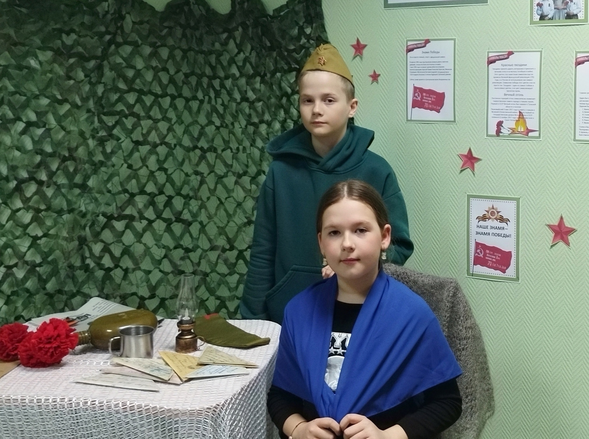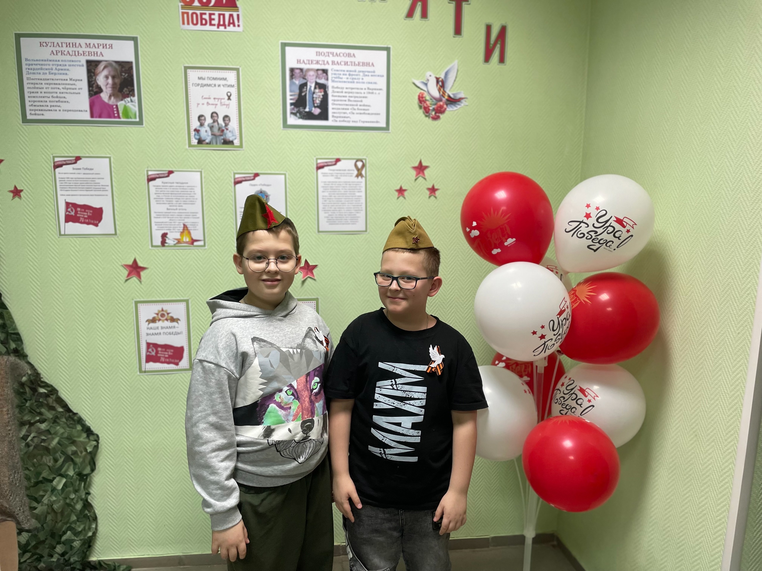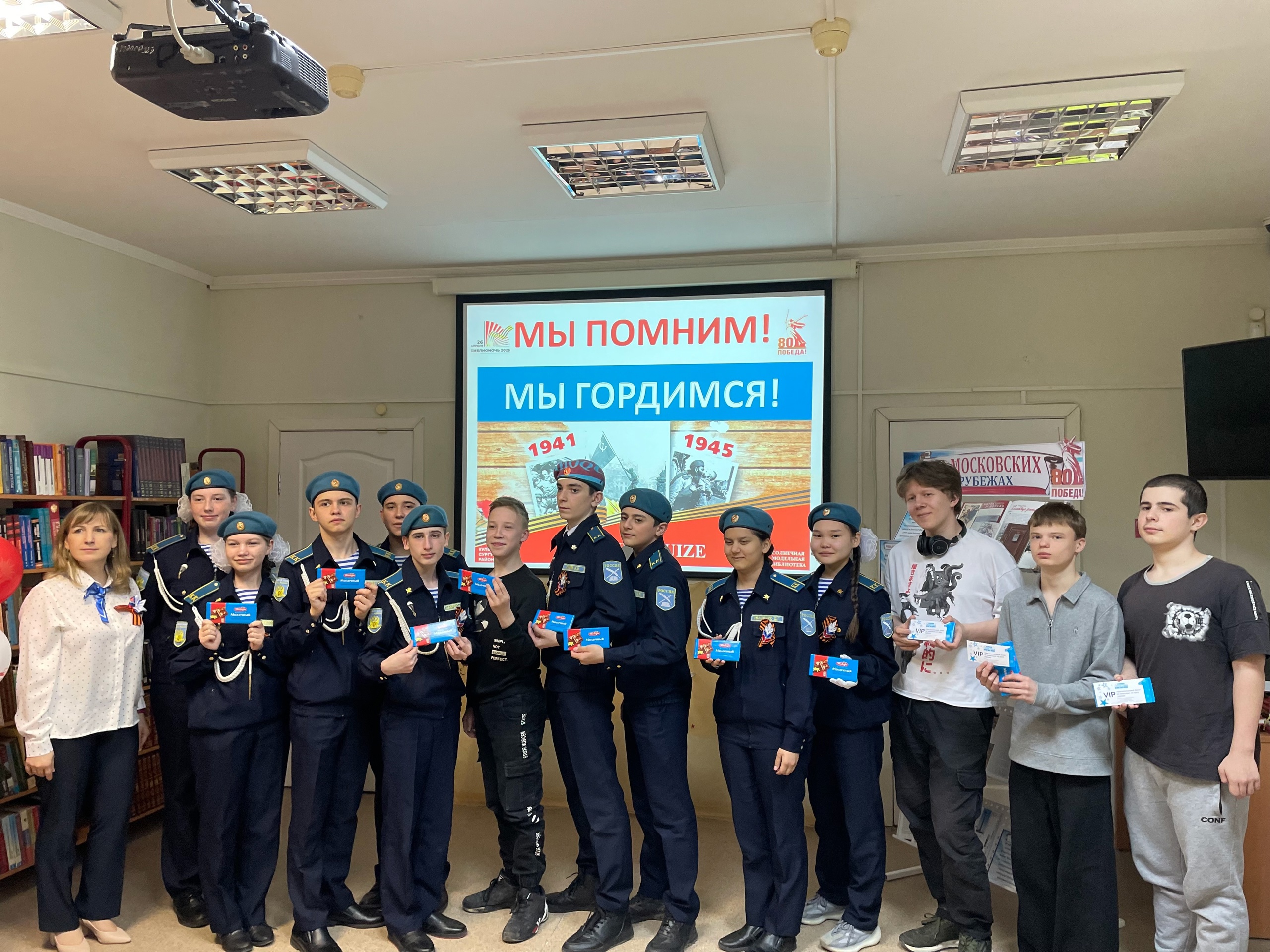 С песнями о войне, георгиевскими ленточками и архивными копиями газеты «Правда» от 10 мая 1945 года встречали волонтёры участников акции в Солнечной модельной библиотеке. В фойе гостей ждала красочно оформленная фотозона, где все желающие могли сделать фотографии на фоне маскировочных сетей, надев пилотку или накинув на плечи синий платочек. Центром внимания стали фотографии «Стены памяти» участников Великой Отечественной войны посёлка Солнечного Подчасовой Надежды Васильевны и Кулагиной Марии Аркадьевны. В знак памяти о встрече гости получили угощение – российский шоколад с символическим названием «Победа».